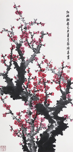 张培基先生的美术创作起步较早,1973年就入浙江省慈溪市文化馆从事美术创作,1974年美术作品就入选省级美术展览会。在几十年的军旅生涯中一方面坚持文学创作,一方面重视对书画的研究,近几年又对花鸟画情有独钟,他创作的水墨葡萄、荷花系列,深受读者称赞,特别是风雪梅花系列,更是意趣、意蕴、意境、意韵别致,把梅花融入隆冬天地,凌寒傲立、刚气风骨、挺拔坚韧的梅君之风一览无遗。风雪中的寒梅与身披白雪的喜鹊、山雀、白头翁等诸鸟构成一幅幅超然的画卷,红梅、白梅、蓝梅、墨梅各显神姿,苍劲的枝杆托起无数绽放的花朵,天趣盎然,神气十足,令人陶醉,赏心悦目,勾起无限的想象空间。而由他本人创作的梅花诗题记,更增添了诗书画融为一体的文化内涵和文化底蕴。张培基先生的花鸟画布局合理,笔墨调合,构思精心,画面大气,经典古朴,画面凝重而沉稳,清雅而淡远,笔墨情趣浓郁,文人气息厚重,既格调高雅,又内涵丰富,特别是对各类鸟的表达,姿态各异、栩栩如生,传承了江寒汀花鸟画的很多意蕴和技法。张培基先生还善于把书法的笔墨技巧融汇于美术创作,这从他的墨梅系列作品中可见一斑。往往一幅四尺整张的作品,全部用墨色表达梅的枝干、梅花、鸟类,在黑白两色中绘就寒梅、布势寒冬、衬托寒意、呼啸寒风、营造寒境,真可谓 “寒梅一剪万般娇,风雪几多气汉宵。轻巧体姿何落处,银花千片水漂流。”(引自培基诗作)